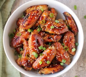 For the final step, he sprinkled white sesame seeds on the wings before serving.